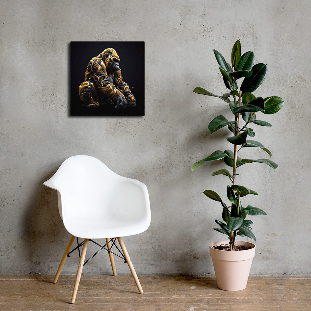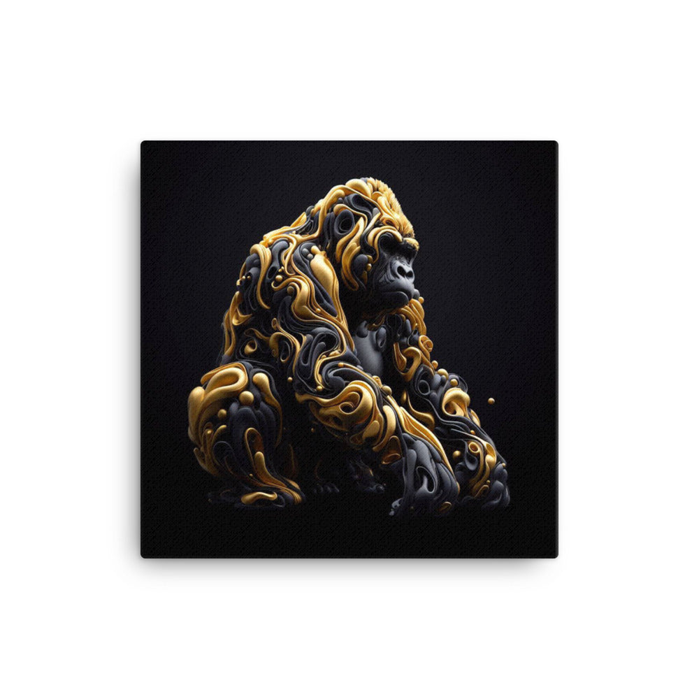 Using AI we were able to create this flowing and vibrant image to provide you with a one-of-a-kind artwork of an ape in old gold and black printed on canvas.