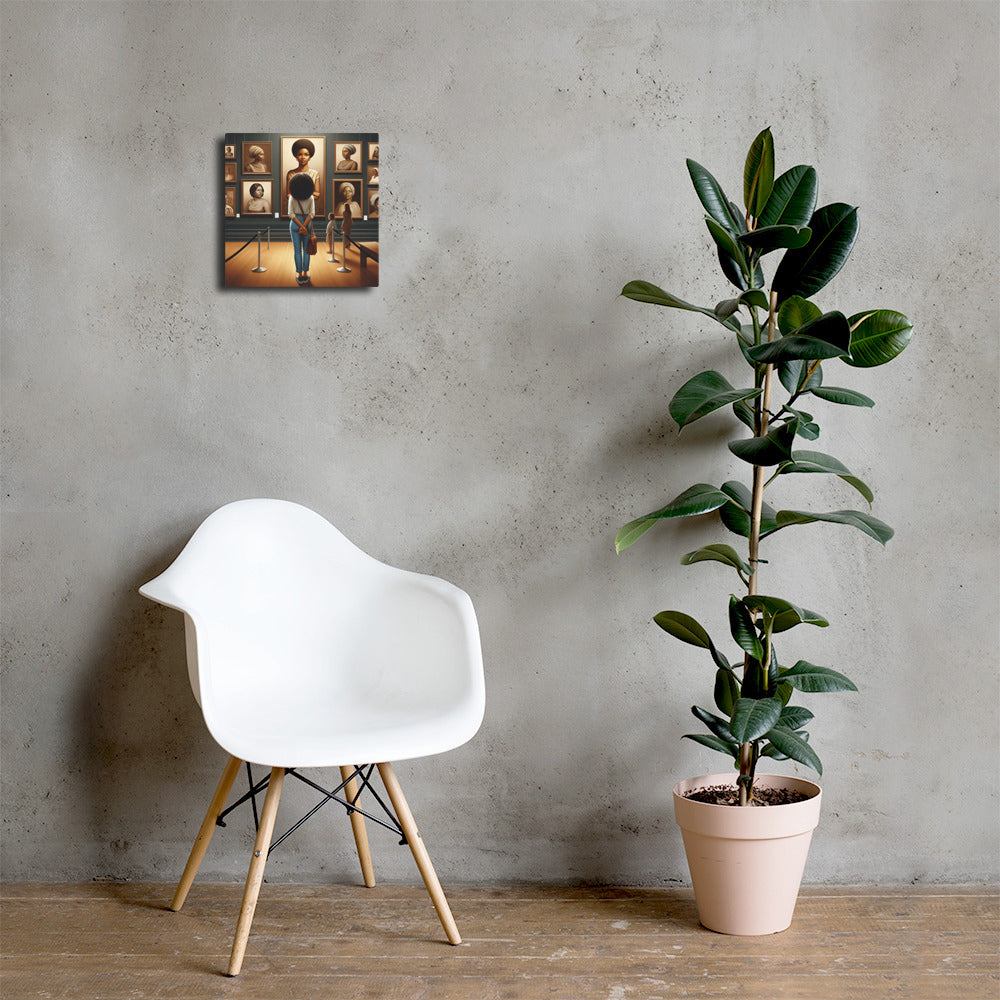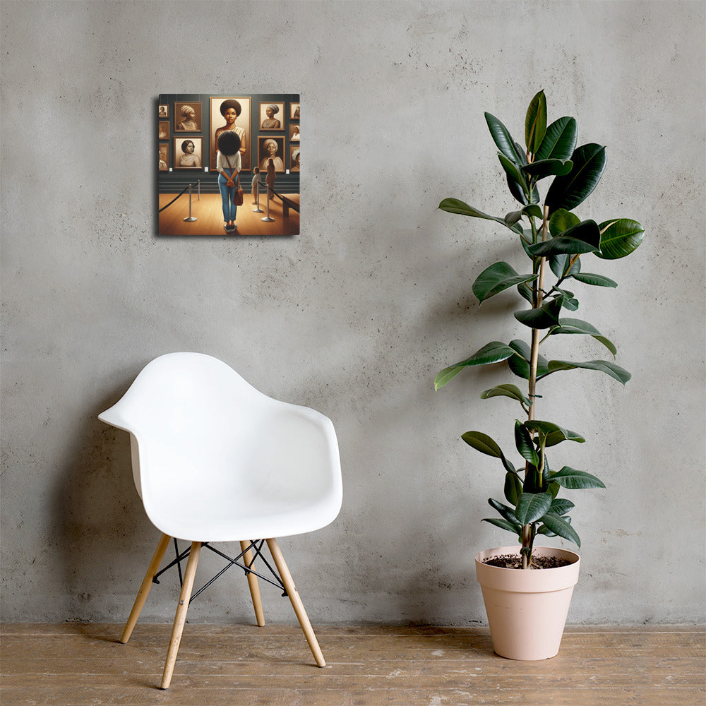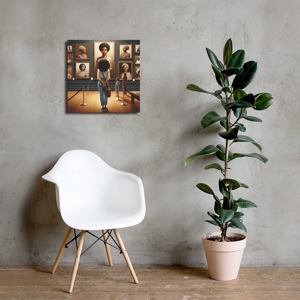 With the help of AI, we wanted to convey a powerful image of a black woman gazing at a black woman from the past. The work is then gazed upon by you providing a double-introspection into the piece.
